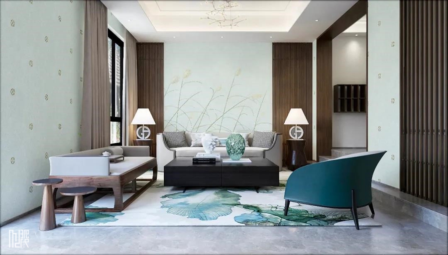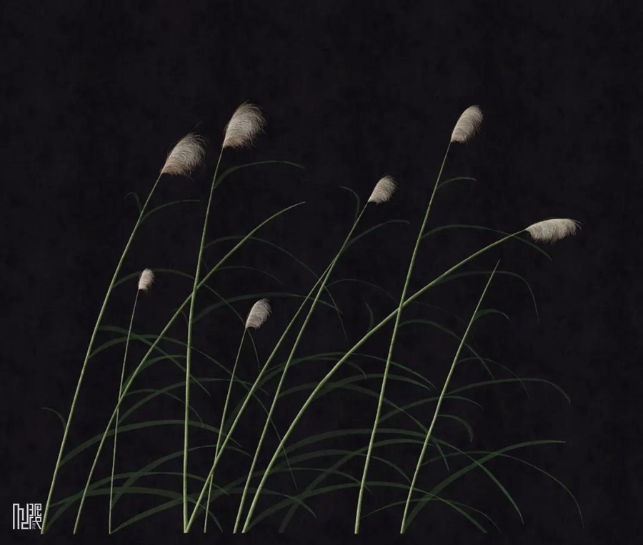 ▲《絮舞轻扬》:行云缓缓,流水潺潺,苍茫的基调隐约显现。于其中,苍劲,缭乱,芦苇的遗世之美,与画面得到逐一贴合。一场情景,一份心境,设计将芦苇所涵盖的福泽纳入其中。在这个既定的空间里,时刻感受“蒲草韧如丝,磐石无转移”般极富文学意趣的爱情境地。