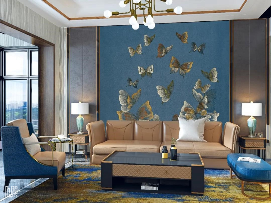 ▲《蝶》《浮世绘》意大利、英国设计工作室手工原稿绘制,融合线条感十足的手工针刺绣,体现出蝴蝶振翅而飞,坚毅又轻薄脆弱的灵动感,以及席卷包括Gucci、Hermès等在内的国际奢侈品牌新品的花型纹路。更有多款新品于此届展会中于观众碰面,其中包含独绣、刺绣、提花、素色等等全品类墙布。