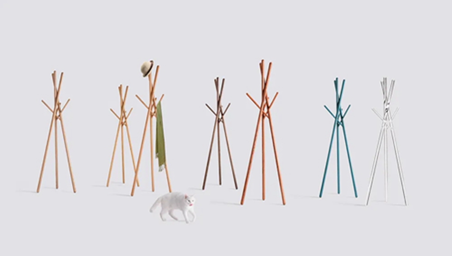 衣帽架通过木质部分不同的开孔角度,与金属杆穿插拼合,底部形成稳定的三角结构形式。极简造型下,透露出一种静默的力量感。不同的视角,亦呈现出各异的造型形态,犹如舞者优雅而又笃定的身姿。