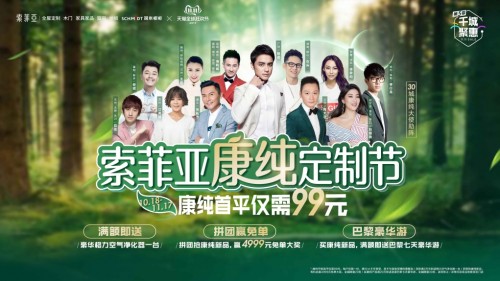 除了有众多明星大咖担任索菲亚康纯板推广大使外,值得一提的是,本次 “索菲亚康纯定制节”活动优惠力度空前,包括有“无醛添加康纯首平(投影面积)仅需99元”、“缪斯香颂系列,参与拼团即可享受1899元/平方,还有机会赢4999元免单大奖”、“满额即送价值4599元格力豪华空气净化器、“满额送浪漫巴黎七天豪华游”等一系列的劲爆优惠,势必在全国掀起一场“健康家,选康纯”的家居环保体验风暴!