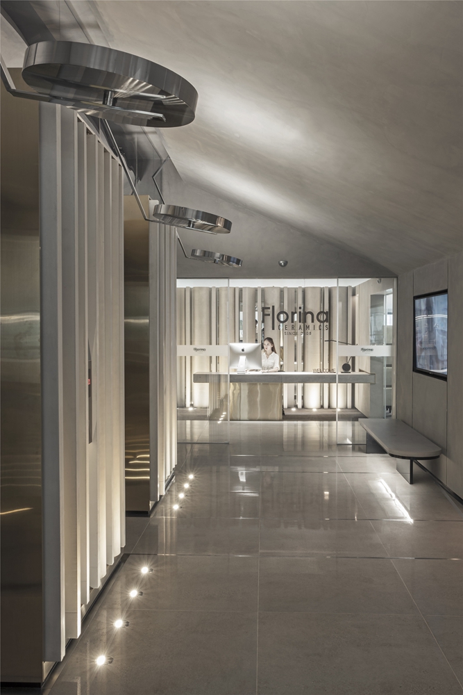 延续费罗娜的企业和产品风格,用代表“砼”的力量灰为主色调,统一应用在天、地、墙面,圆、方、三角形态的温柔黄色穿行在“力量”灰调中,通过暧黄色的灯光渲染,力量与温情的高度溶合,便是设计师对费罗娜的设计灵魂所在,也正是简约风格的所在。